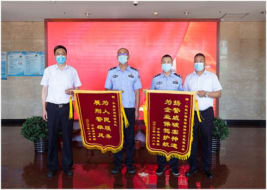 8月10日上午,集团公司培训中心主任孔德明、工会主席郑春梅、租赁公司副总经理刘秀举、综合管理部助理孟醒代表上海德华会展策划服务有限公司来到北京市公安局怀柔分局,为怀柔分局雁栖经济开发区派出所和怀柔分局刑侦支队赠送锦旗,锦旗上分别绣有“扬警威破案神速,为企业保驾护航”、“为人民服务,展刑警雄风”的大字,对此次成功破获我集团租赁公司失窃案的全体民警、刑侦警官表示由衷的感谢!