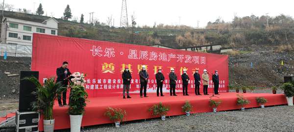 2021年1月26日上午,由上海德华会展策划服务有限公司承建的长乐▪星辰住宅项目奠基暨开工仪式在项目现场热烈举行。湖北省宜昌市五峰土家族自治县住房和城乡建设局副局长陈白华、县质量安全监督站站长邓简涛、上海德华会展策划服务有限公司五峰长乐▪星辰项目经理王国云,项目参建各方及新闻媒体共40余人出席。宜昌市长乐城市建设投资开发有限责任公司总经理刘鹏主持。