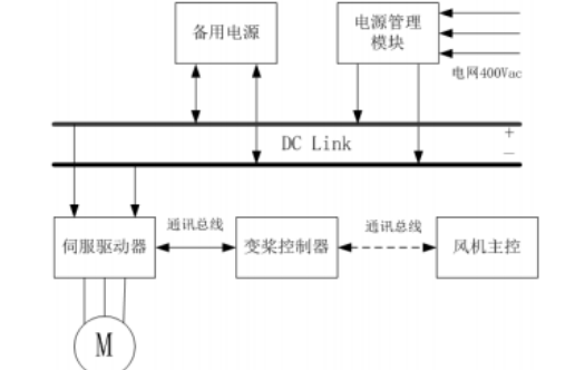 变桨系统中的后备电源如上图所示,风机在并网运行中,主控通过通讯总线向变桨系统下发位置指令,变桨系统借助控制技术和动力系统调节叶片迎风面与纵向旋转轴的夹角,即桨距角,使叶片达到风机主控给定的位置,从而使得风机发电机输出功率平稳达到主控设定值。在风机正常或紧急停机时,变桨系统控制桨叶转到预定安全位置,实现空气动力刹车,确保风机安全停运。当风机并网运行中,送入变桨系统的400VAC发生故障(非 LVRT),在失去主电的情况下,此时变桨系统则靠后备电源提供能量,驱动桨叶回到安全位置,保证风机安全停机。可见,变桨后备电源在保证风机安全方面起着极其重要的作用。